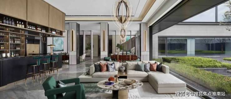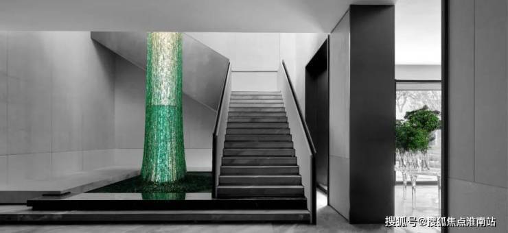整个会所都围绕着下沉式庭院分布,通过每块超白玻璃,巧妙的将庭院里的植物和水景,过渡到室内,使得室内和室外景观“内外合一”。