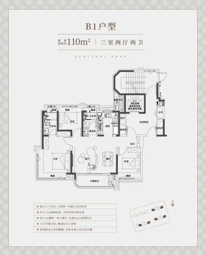 建面约110㎡三房边套户型,约5.4m超大横厅、南向面宽做到了惊人的约12.3米,堪比别墅级别的产品!巨幕阳台+边套270°景观视野,空间体验与采光感拉满!