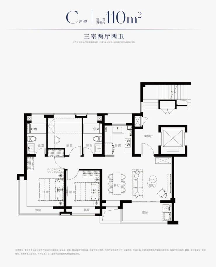 此户型在103㎡户型的基础上,将南向主卧、北向次卧均升级了约270°转角飘窗设计,采光视野及美观性都得到了极大提升。