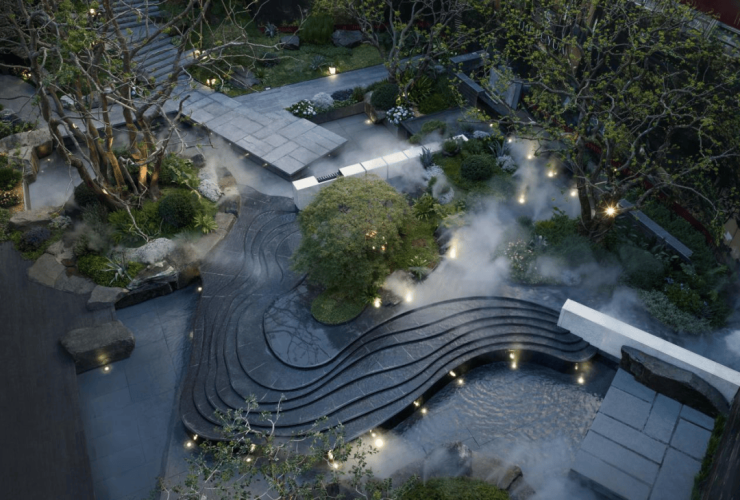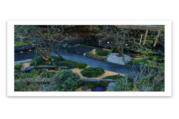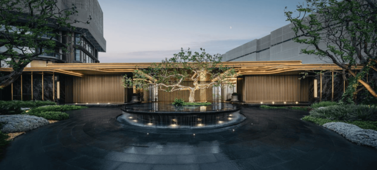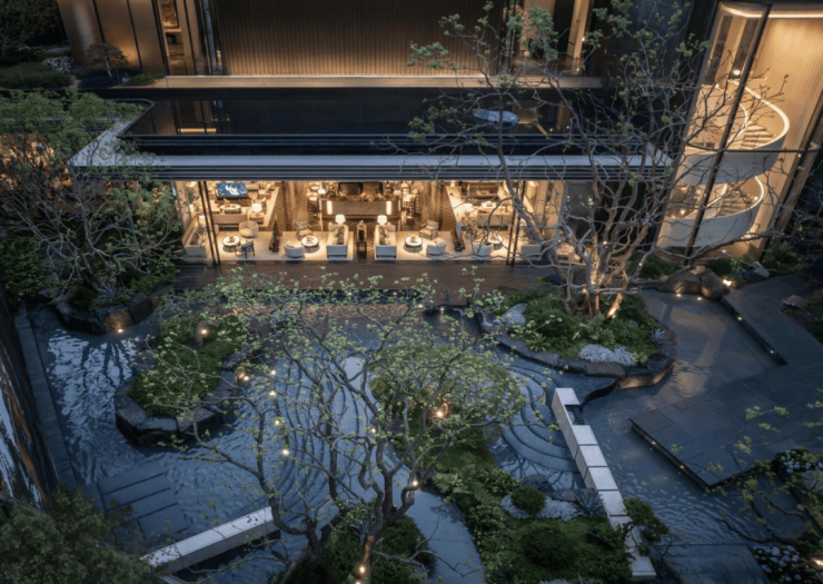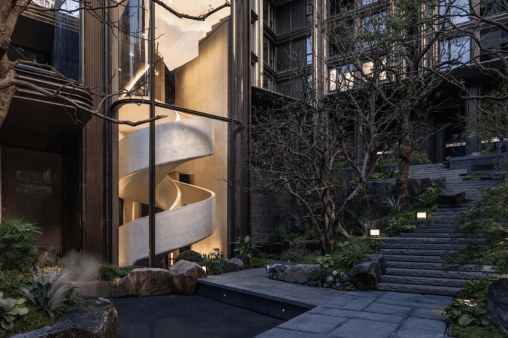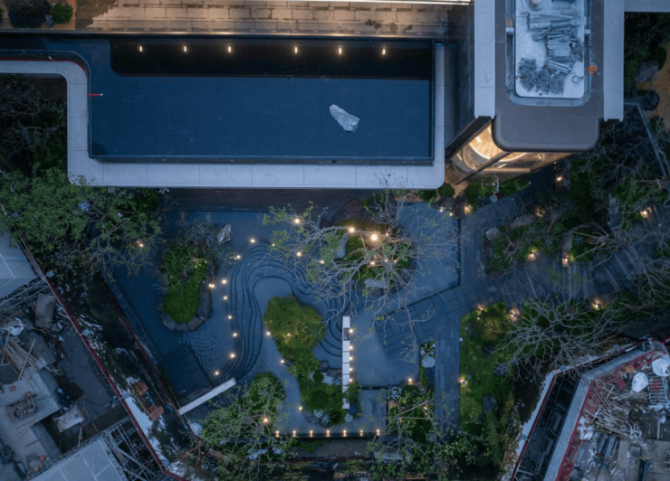 近2000㎡下沉庭院:玉扣绿岛、风籁禅境、登云之梯等多重景观共融,开创上海惟此山川溪谷立体庭园
