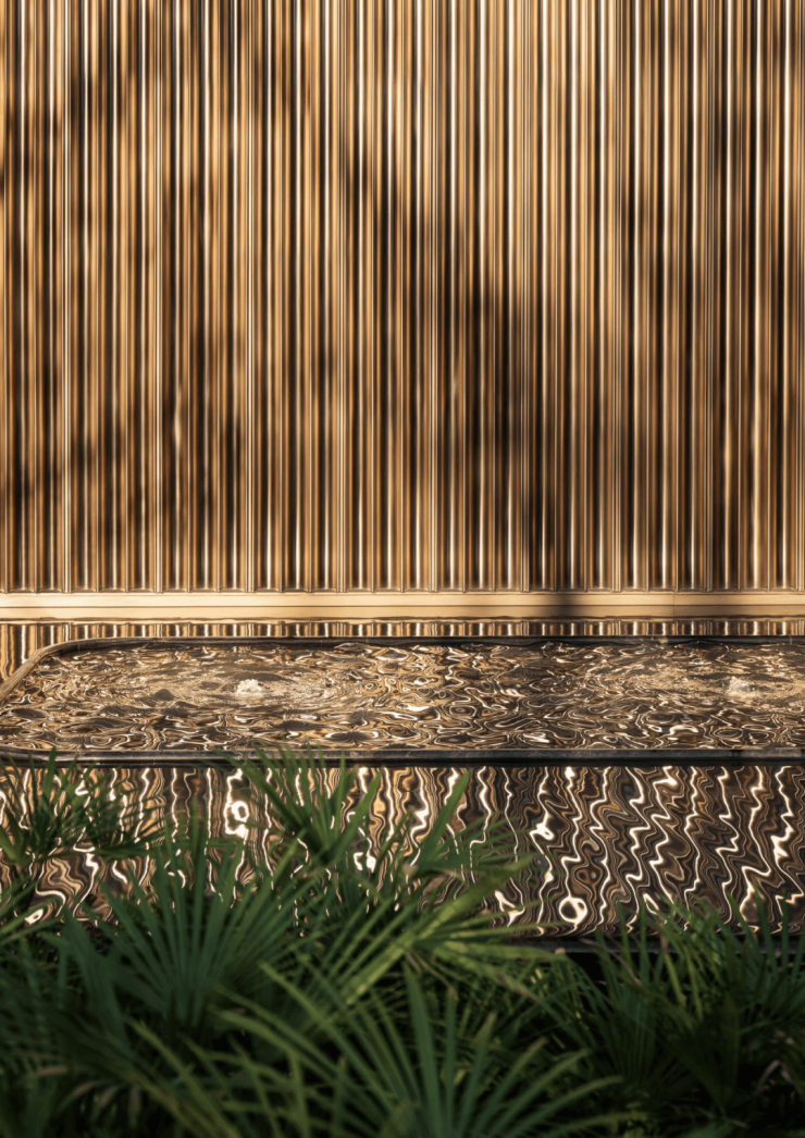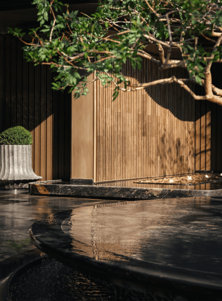 门庭水景池底镶嵌银河金奢石,以水刀精工雕琢纹理,让星空银河流淌于日常风景。