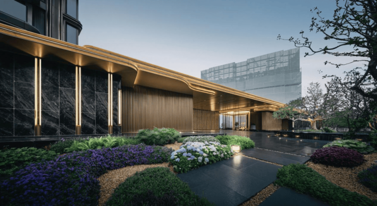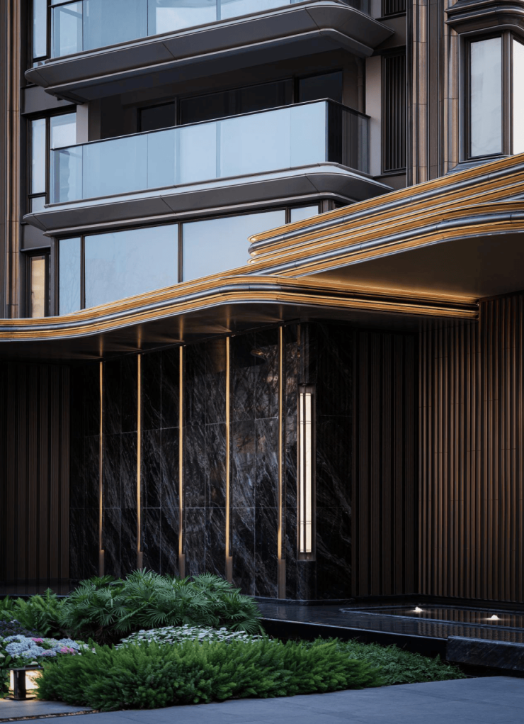 360°全向立面设计:东西南北四个面皆为正面,类一梯一户无连廊。经典三段式布局,大面积采用铝板+陶+玻璃,以中西合璧的国际东方美学引领时代潮流