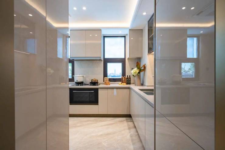 项目厨房使用方太的灶蒸烤一体机、吸油烟机三件套交付,更有弗兰卡的水槽、龙头,定制橱柜,诺贝尔的地面、墙面,石英石台面等。