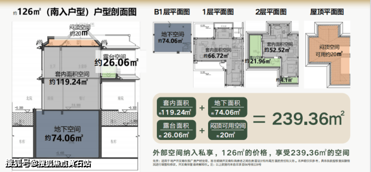 以126平别墅为例,套内可用面积约119.24㎡,赠送地下室面积74.06㎡+露台面积26.06㎡+闷顶可用面积约20㎡,实际可享受239.36㎡的套内空间+约150平的庭院面积。