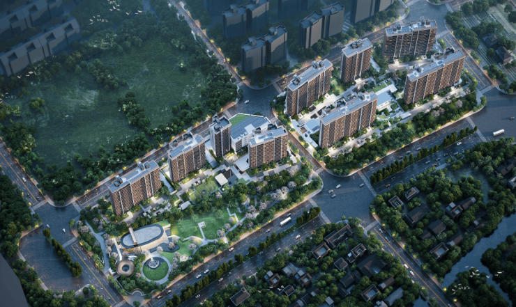 高层住宅组团式布局,整体排布均质,同时设计强化住宅空间与社区中轴线景观在视觉与空间上的联系,提升社区品质。