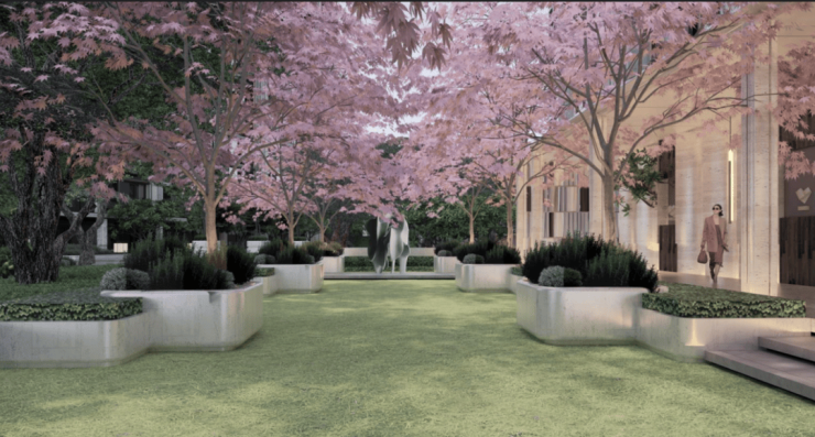 150M社区入口超宽界面结合大水景、天然石材和罗汉松,打造礼仪式归家落客界面,也将度假感受完整引入业主的日常生活,实现 “出则繁华,入则度假” 的生活场景。在用地边界上,进行红线内外一体化开发打造,利用外部1.7万方绿地,小区内部景观与外部绿地一体化开发,模糊城市与社区之间界限,消融社区封闭和冰冷感:在红线外,打开城市松弛感,将全球风景纳入日常重构松弛生活的新生态;红线内,甄选了全球代表性的五大花园进行场景落位,让每一次游园成为穿越世界的旅行。