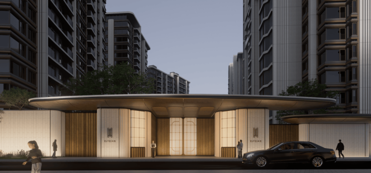 社区大门的优美的建筑弧度,来源于希腊One&Only 的唯逸度假酒店,让建筑犹如灵动飘逸的缪斯裙摆;在材料色调上,集萃上海文脉的“摩登金”,映射了十里洋场的复古韵味,与贝金米黄、香槟玉石等天然奢石 交相辉映,形成温润而精致的美学触感。建筑立面在温润放松与精致摩登之间取得完美平衡,以微弧元素为母题,致敬上海artdeco摩登气质,采用米白色与金色等温暖色彩的材料与去棱角化的造型设计创造温润如玉的立面印象。