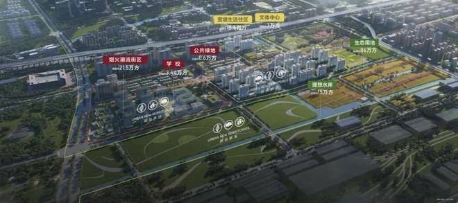 约180万方的体量,除了住宅,还包括有约21.5万方潮流街区+约86万方自然秘境+约15万方理想水岸+约3.44万人文教育+约3万方文体中心!