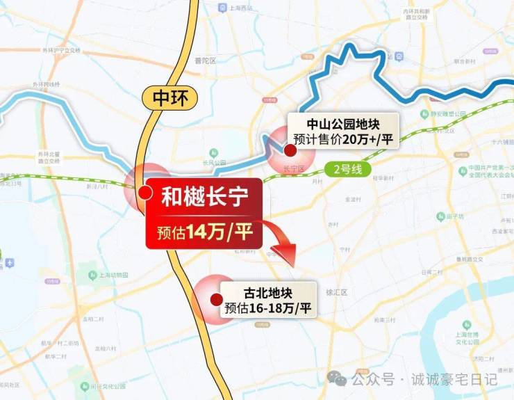 既然天山路住宅收官,我们放大视角来看周边新地:与和樾长宁同环线的吴中路光明乳品厂地块预计售价至少16-18万/㎡(旁边的古北壹号挂牌价超过22万/㎡)。与和樾长宁同2号线的中山公园地块预计售价或超过20万/㎡。