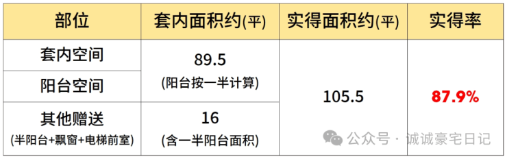 该户型大量的飘窗+双阳台设计,保证了每个功能间的通风采光,也提升了户型的实得率。经过专业建筑师测算,假设阳台全部封闭的情况下,项目建面约120㎡户型实得面积约105.5㎡,实得率约88%。(该实得率数据根据实得面积预估计算所得,仅供参考,不作为置业依据。最终得房率以购房合同为准)