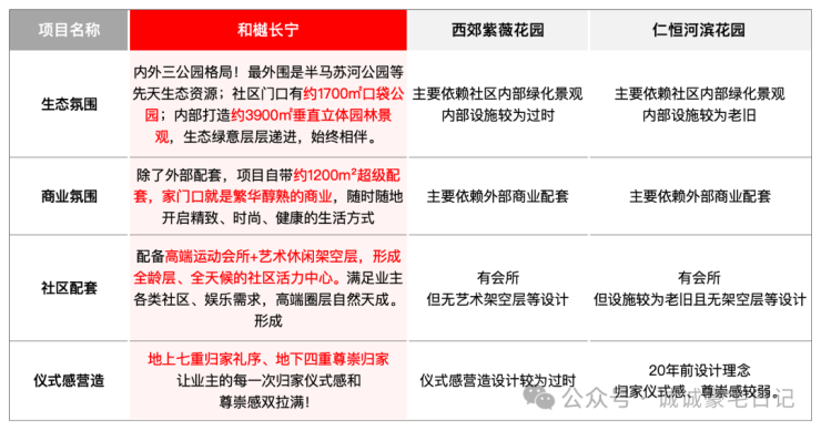 和樾长宁的迭代首先是公区发力,我们可以对比下同板块3个关注度较高小区:和樾长宁、西郊紫薇花园、仁恒河滨花园(最新挂牌价也有12万+)的公区配置。