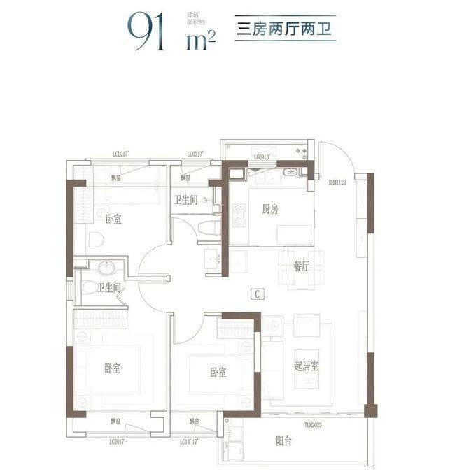建面约91㎡-121㎡ 3房2厅2卫;这几个户型都是3房的设计,满足想一步到位的购房者。3开间朝南+客餐厅连通阳台+全卧室飘窗,以及套房式主卧设计+2卫,即使是三代同堂,也能让生活从容。