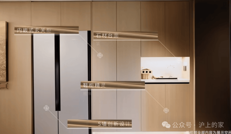入户后,第一眼就可以看到玄关柜采用石材台面,下至标配 鞋柜精灵,在S墙创新设计后 ,首批次房源更是额外赠送西门子双开门冰箱 ,这在以往可是上海千万级新房的交付标准: