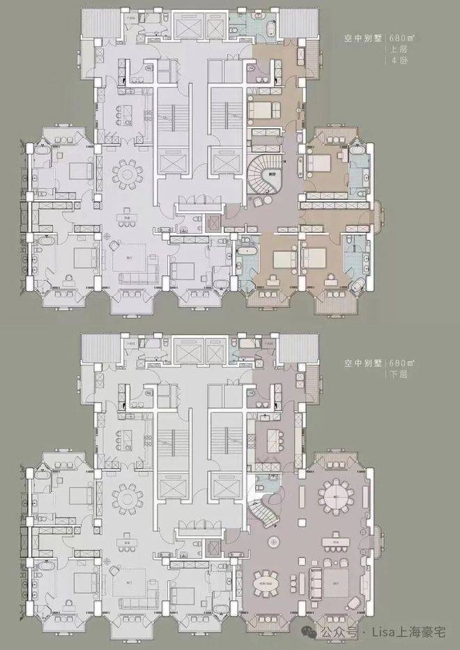 3号楼单元建筑面积:约600㎡—1220㎡住宅部分全部大平层(复式)设计.