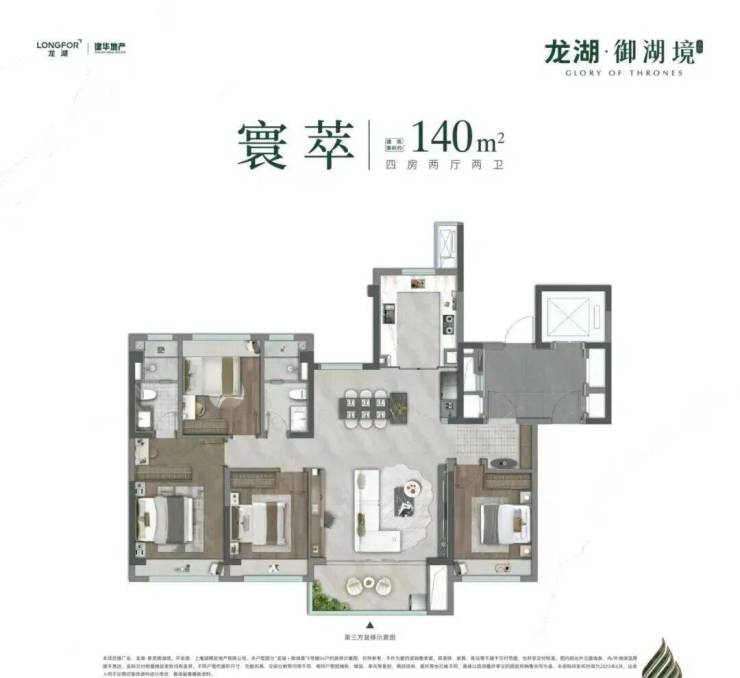 约 140 ㎡超配四房洋房,奢阔双厅南北通透,还可改造成约8m巨幕宽厅,