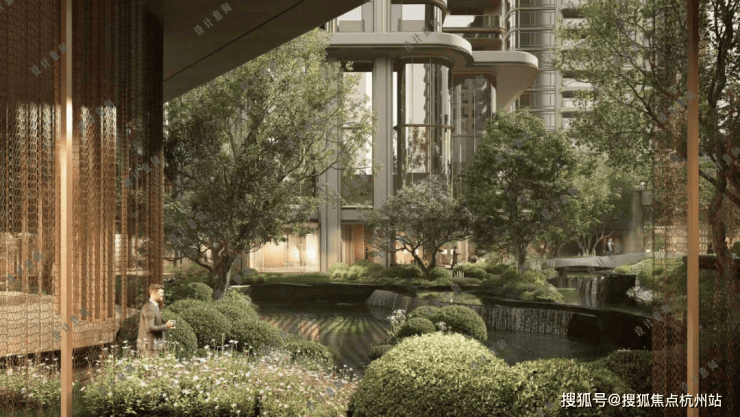 三层归家动线:从地面景观层到架空层,再到入户层,穿越绿植、光影与水景,步步进入私域。