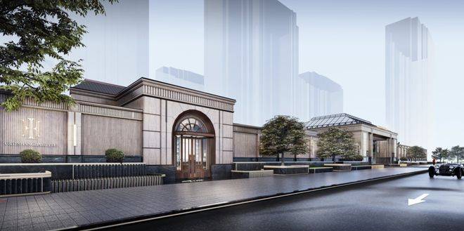 从效果图看,建发这次将在上海首次引入海派风格,我们能在效果图上看到大量海派元素:先说大门头,就有非常明显的和平饭店元素: