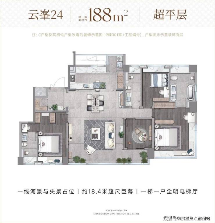 建面约148–188㎡四房:大面宽短进深,部分户型带转角飘窗,得房率表现优异