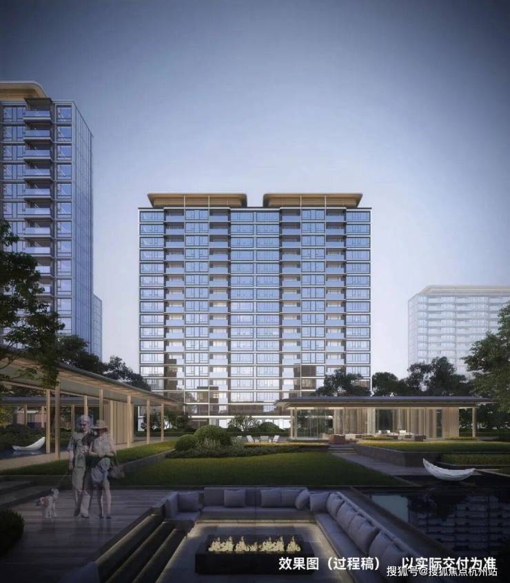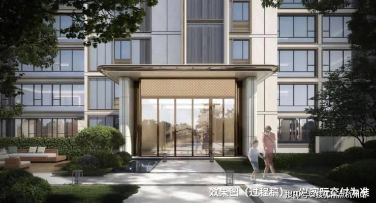 在建筑立面上, 通透玻璃幕墙叠加铝板, 缔就钻感镜幕墙, 「江湾之钻」钻感面屏+大窗墙比,地标艺术美学, 境启全新奢宅风尚。营造 约60m尺度奢阔归家门庭 ,通过奢石、铝板、水景、弧线等精妙组合,成就江湾显赫的府邸门面,礼遇每一次的世界归来。