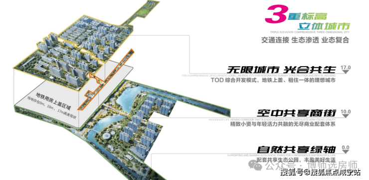 二度 标高10m:配有生活服务配套,商业、公园、办公。1万㎡精致生活配套 、 盖上商业文化、体育文化、养老医疗、行政管理健康四轴。