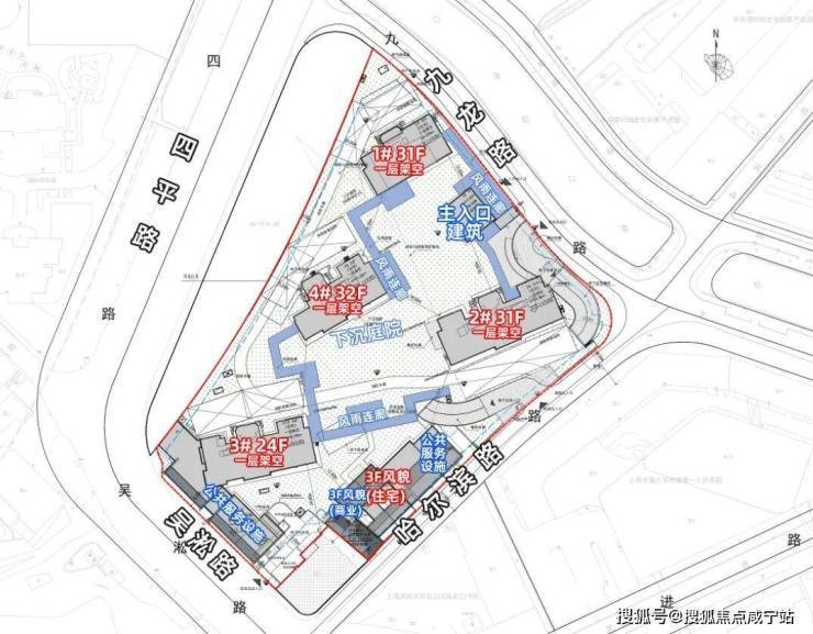 具体来看,1#总高31层,一层架空;2#总高31层,一层架空;4#总高32层,一层架空;3-1#总高24层,一层架空;6为风貌建筑,总高3层,含商业和住宅。在景观设计方面,小区内规划了景观架构、风雨连廊以及下沉式庭院。