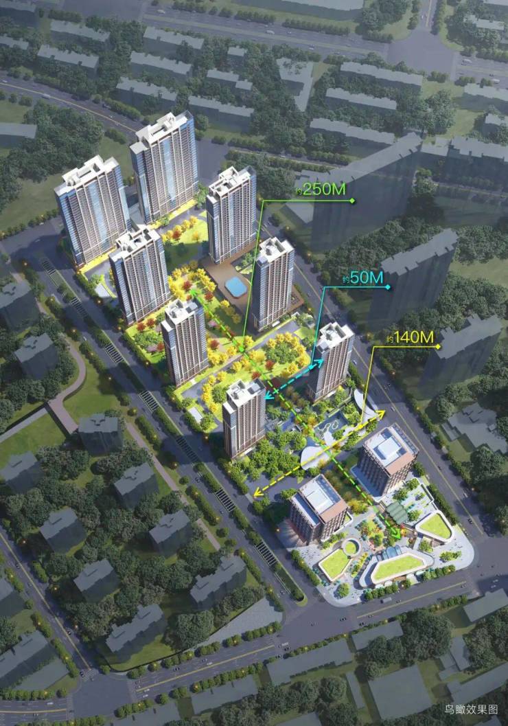 更关键的是主景观轴——纵向约250m、横向约140m,楼间距约50–57m,这在市区紧凑地块里极为少见。