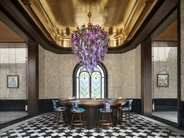 目光所及之处,各种精雕细琢的工艺、用材,则见不惜成本、兼容并蓄的匠艺。上海海鸥丽晶酒店同款的巴西金石材、储存量较少的玻利维亚蓝石材、华山公寓的掐丝珐琅工艺,在展现海派风情的同时,彰显奢华的质感。