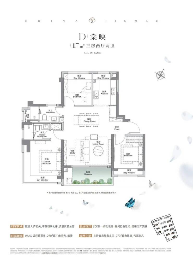 ✅✅金茂棠前售楼处电话:400 - 1010 - 064✅✅建面约105㎡三房:飞机户型没有浪费的过道面积,对空间的理解做到了极致,三开间朝南+4个飘窗+双面阳台系统+主卧套房设计+270°转角飘窗!✅✅金茂棠前售楼处电话:400 - 1010 - 064✅✅
