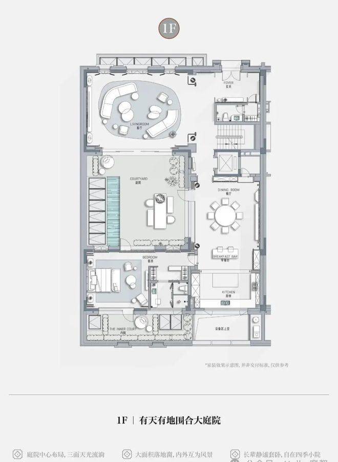 庭院中心布局,客厅、餐厅、卧室三面均可采光,内外相映成趣