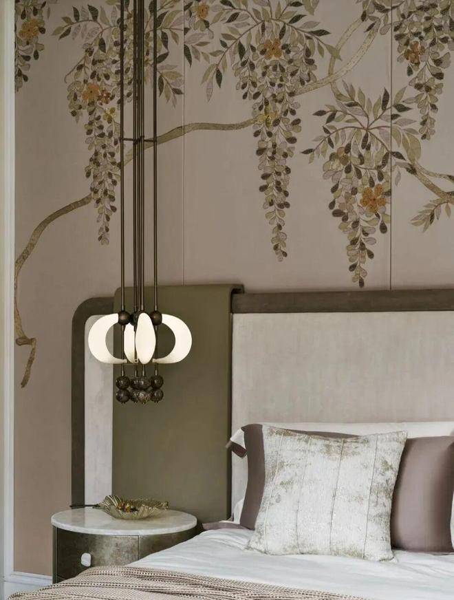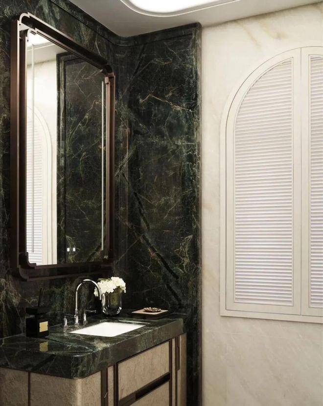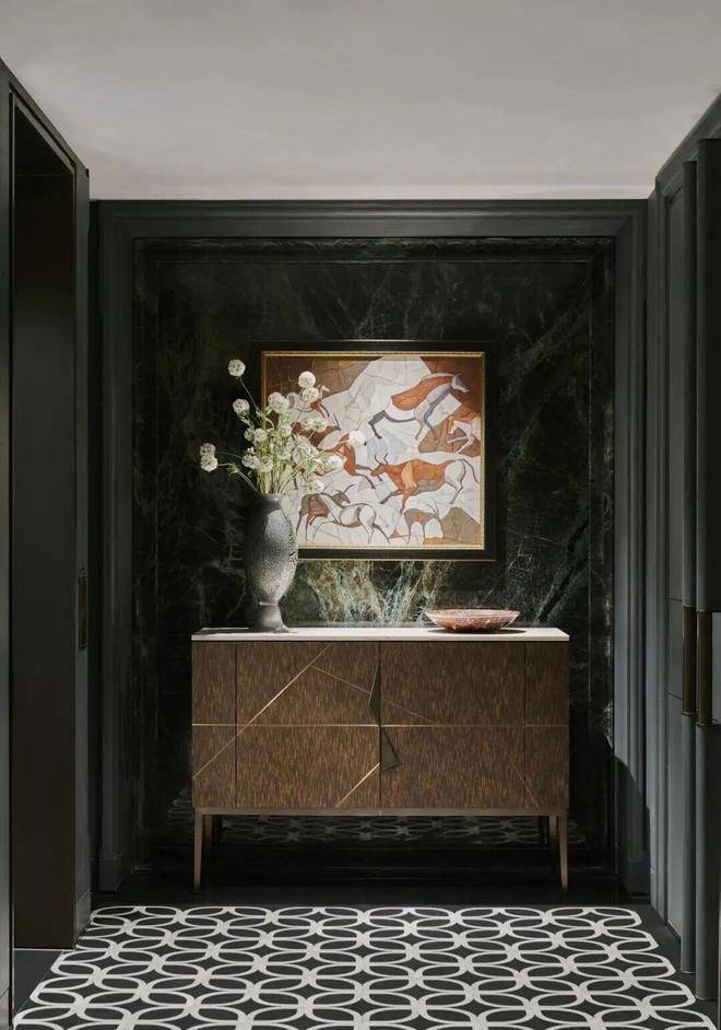 建筑面积约495㎡传家大宅,海派气质内外辉映;深色木饰面与柔和的刺绣主背景,框定空间层次格局,营造稳当厚重的氛围基调,法式留白的墙面与顶部造型,与原筑提取的典型拼花地砖相呼应,经典的精致与典雅,海派传家大宅的气度不言而明。