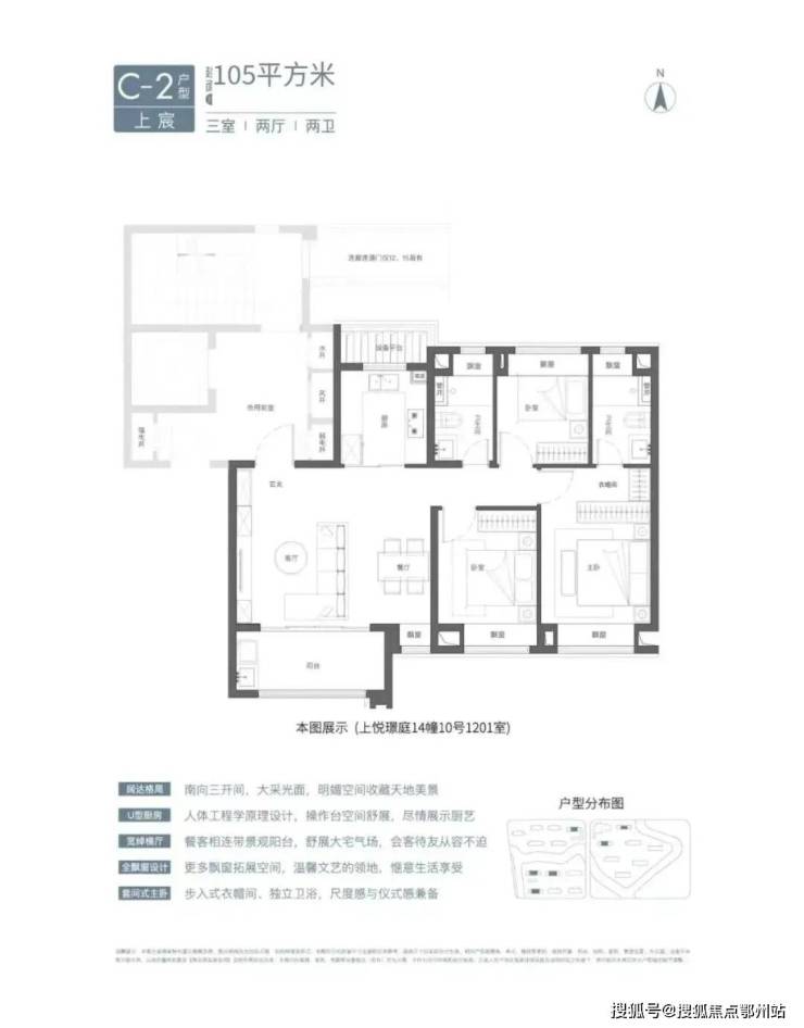 建面约105㎡3房2卫有宽厅和竖厅两种风格,其中宽厅户型好评度颇高。
