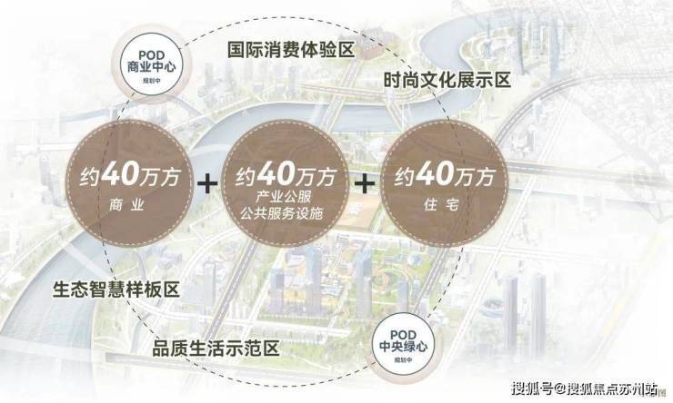 约40万方漫步式街区,涵盖露天剧场、水上运动、艺术文化业态(2.8万方)及新一代WELLBEING办公;