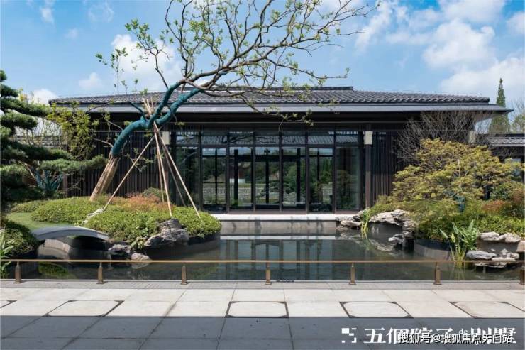 入口右侧是迎宾的组合造景,选用泰山石组景以及黑松、砾石等中式元素,和小区整体江南水乡风格相得益彰.