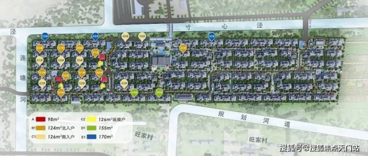 产品为建面约98㎡、124㎡、126㎡(南/北入户)、126㎡(连接户)、155㎡、172㎡合院.