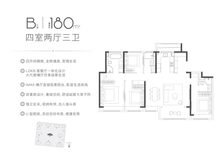 约172㎡和180㎡的4房3卫的户型,南向五开间朝南,整体的采光度、尺度感堪比别墅。