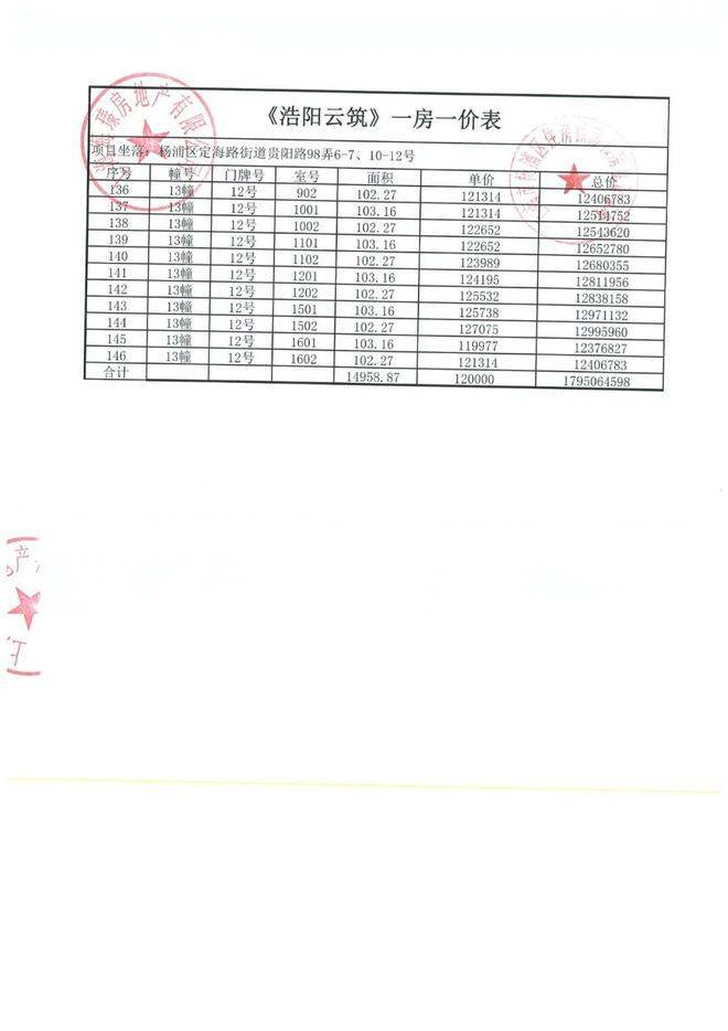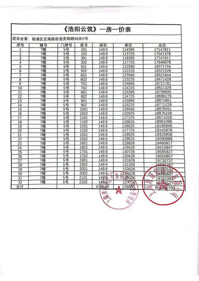 上期一房一价表: