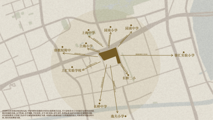 距上海“四校”之首的百年名校——上海中学直线距离仅约320米;距园南中学直线距离约650米,该校近年来中考升学成绩在徐汇区排于前列,连续三年中考区内公办第一;距公办二梯队小学园南小学直线距离约400米,对口初中即为实力不俗的园南中学;距九年一贯制上汇实验学校直线距离约500米,虽为成立于2021的新校,但作为上海中学的“亲孙子”,其影响力早已扩张开来。