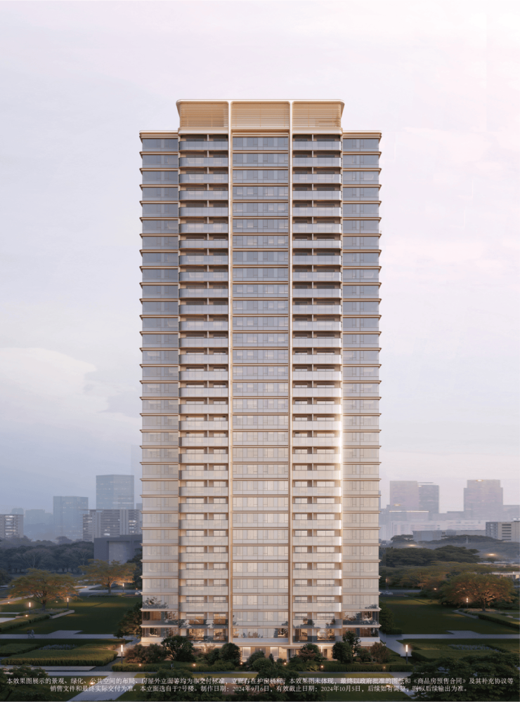 建筑方面,海上·清和玺采用独特的香槟金色格栅塔冠及壁柱,以香槟金与白色调搭配,形成“金镶玉”的立面造型,充分以“玺系”的品质结合在地文化海派以及人群品质需求。大面积的玻璃与精致的层间金属飘板相结合,营造出公建化的立面视觉效果,既保证了通透性,温润雅致且历久弥新。