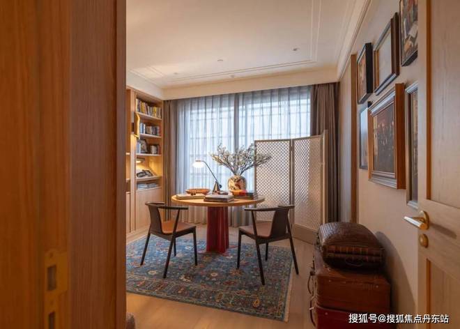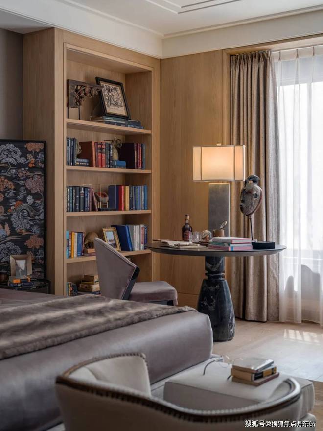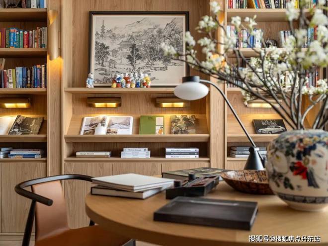 多功能书架彰显着设计的巧思,形成有如博物馆般的展示方式,既可放置日常读物,亦可展示珍本藏书。同时,利用屏风做隔断,与圆桌结合形成私密空间。