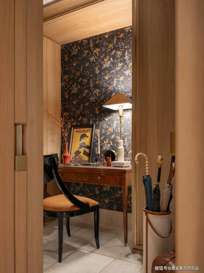 玄关具有变化性与功能多重性,壁纸融合中西方色彩和纹样,除了更衣功能,更摆放了古董书写桌,以手写文字传递信息,传递慢节奏生活方式,丰富空间的装饰和功能,目光所及视角变得丰富。