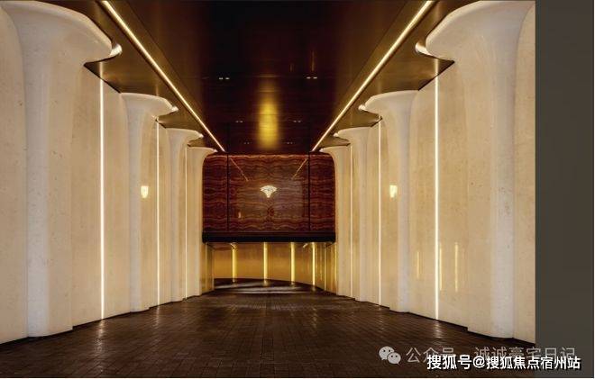 门庭延街的外立面,以精工定制弧形米色石材为主调,✅✅海上清和玺售楼处电话:400-8787-740 ✅✅镶嵌典藏级老虎玉大理石,点缀古铜色现代海派艺术感灯器,整体呈现出百年海派的贵雅气质。