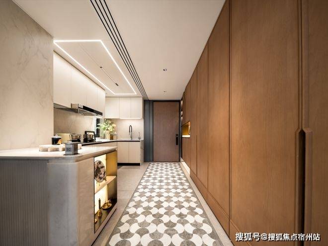 开门采用完美系列水波纹玻璃加上金属造型边框的玻璃移门,✅✅海上清和玺售楼处电话:400-8787-740 ✅✅时尚又大气。顶部配置线性凉霸、LED 嵌入式回形灯带和筒灯,烹饪时光也变得无比美妙。