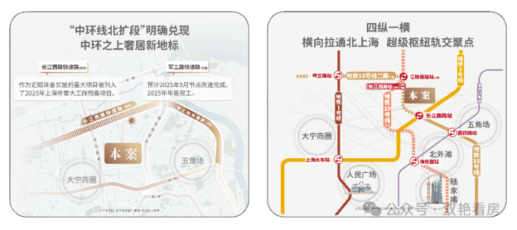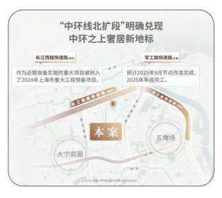 交通方面:项目紧邻长江西路地铁站(直线距离约150米),1站江杨南路,5站复旦,7站五角场。中环线北扩段明确兑现,军工路快速路25年开工,长江西路快速路列入上海市重大工程清单预备项目,快速链通城心,随着中环线北扩段的政策明确,淞南将正式进入中环时间。未来经逸仙高架,进入南北高架、内环高架、中环高架,可快速链通南北上海。
