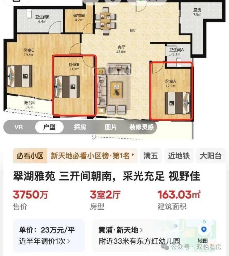 对比链家翠湖天地约163㎡户型,南向次卧套内面积分别是约13.9㎡和约12.5㎡,空间尺度完胜!越级改善的首选产品!