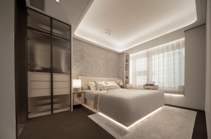即便放了双人床、两个床头柜、一个收纳柜、两个休闲座椅和茶几,空间依旧绰绰有余,尺度感惊人!