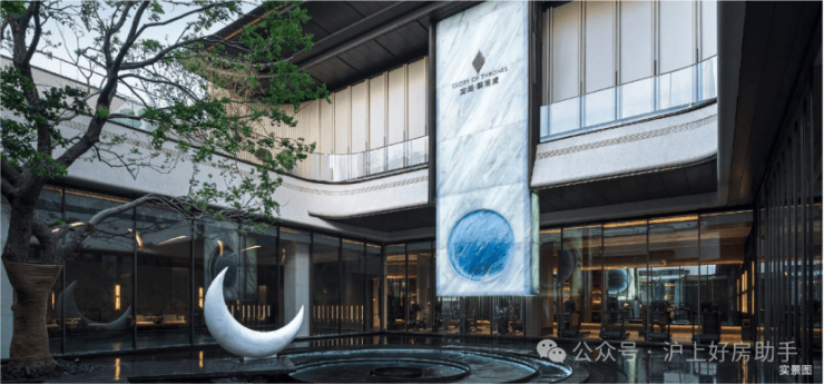 深藏于建筑怀抱之中的下沉式「琉璃光院」,是历经数十版方案淬炼出的灵魂之作。御湖境标志性汉白玉玄月族徽,与高10米的蓝水晶奢石光幕,共同演绎“日月同辉”的震撼场景。庭院深处50年乌桕树王矗立。