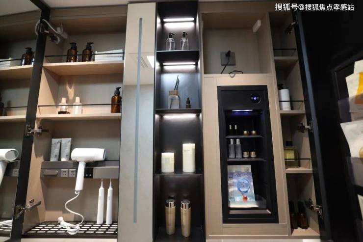 整面墙的镜柜,内部配备了美妆冰箱+门板收纳架+轨道式置物架,储物空间打造的非常充足。🔥招商中旅揽阅售楼处电话:400-8787-740👈🔥