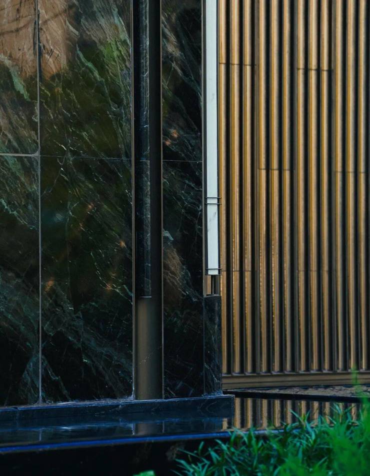 落客区水景底部,铺陈着巴西银河金奢石,深邃的黑色底板上,金色纹理自然随机分布,宛若一条被珍藏的微缩星河