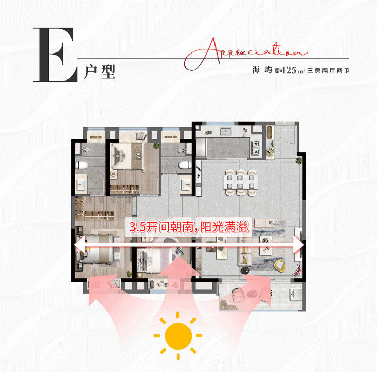 约125平为大三房,每个功能间都非常舒适,能更好满足二胎家庭/三代同堂需求.