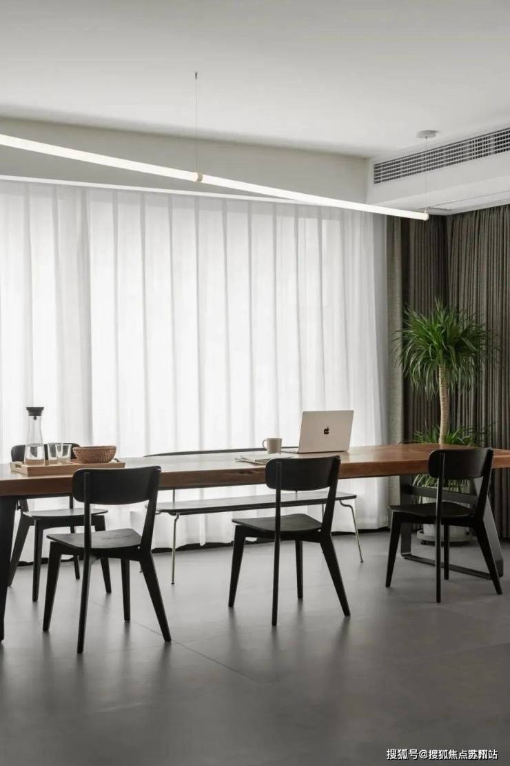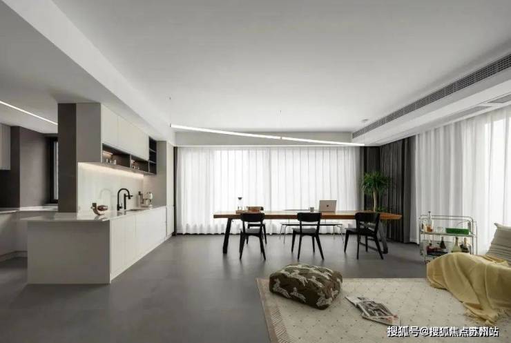 客餐厅采用一体化的设计,空间更加区域敞亮,恰到好处的留白带来了更多的高级感,用懒人沙发和长桌来划分空间,这种划分空间的方法不隔断空间,更加有层次,点线面结合更富东方的美学意境,让人与空间之间相互深度交流.
